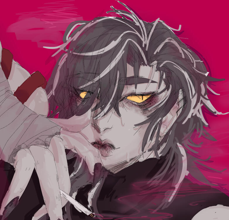 RETURNCONCEPT ART OF PERSONAL CHARACTER: CINDERUIS LITHIUMN - he has gone through many outfits, name changes and hair styles.ORIGINS: Cinderuis is from the bloodline of Chimeric Demons with the ability to shapeshift, but he was born with inability to shift completely, which made him another prey to humanity, a tool of humans to exterminate sinners, to profit off; "THE LAMENT OF DIRUS." just like in human prophecies.Just as his struggles continued to grow so did his insanity to survive.UPDATES: will appear on twitter or bluesky if ur interested!